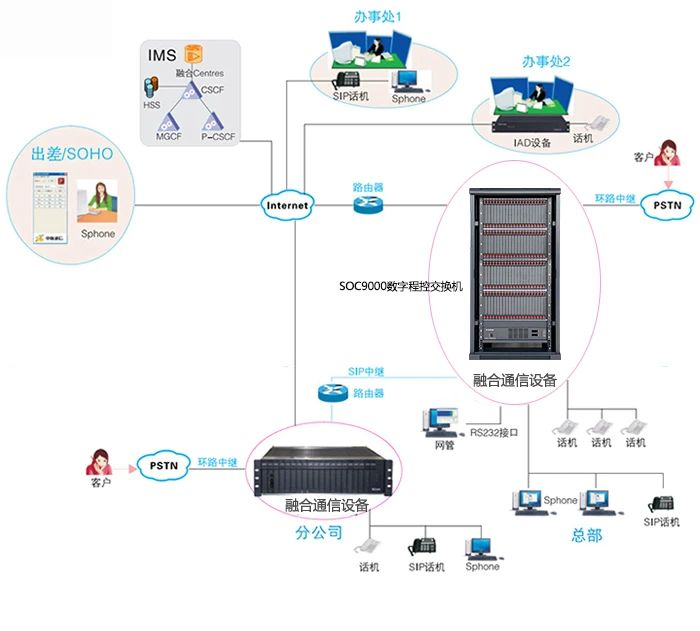 由于本交換機具有多種中繼接口,E1中繼信令齊全,如NO.1、NO.7、PRI等信令,并且整合了VOIP中繼,可為用戶提供多種組網。