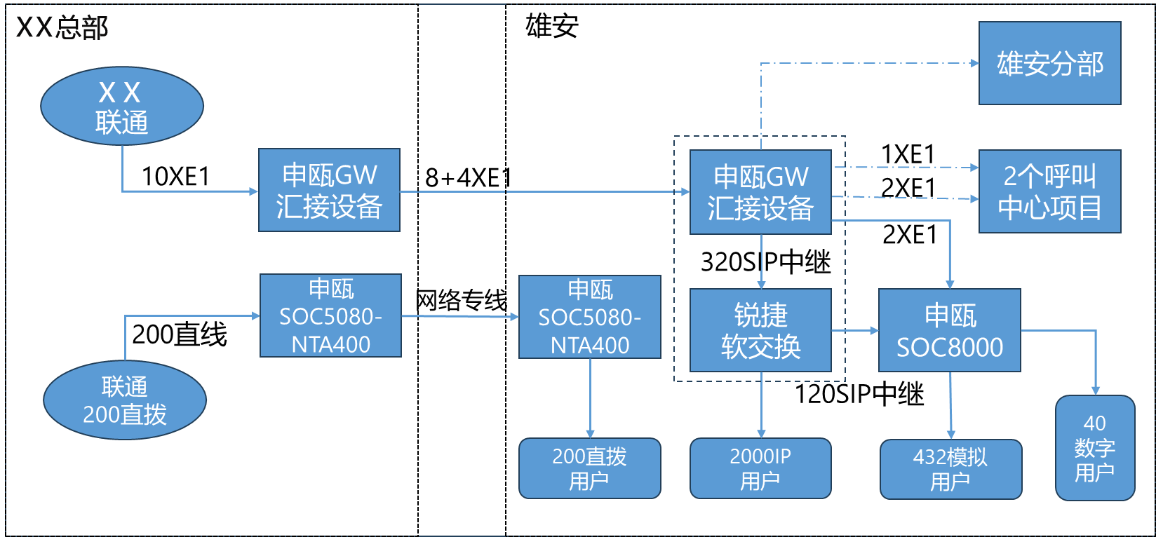 通過10個E1鏈路連接XX聯通,實現PSTN網絡與雄安匯接并與IP網絡的互通;